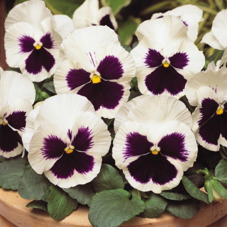Семена анютиных глазок сорта Сильвербрайд позволят вырастить крупные цветы, относящиеся к группе Швейцарских гигантов. Эти экземпляры имеют интересную окраску: все лепестки белоснежные, а на нижних имеются темно-фиолетовые пятна.