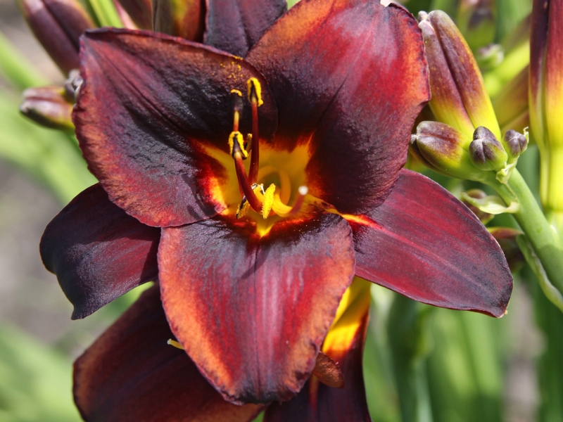 • Окраска цветка : Шоколадно-бордовая с желтым горлом