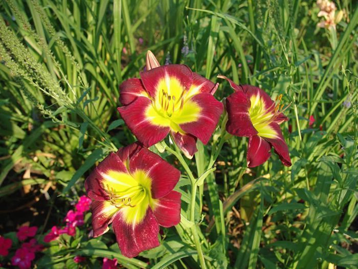 Окраска цветка : Тёмно-бордовая с жёлтым горлом