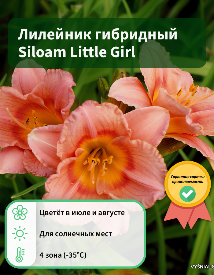 Лилейник гибридный siloam little girl - это настоящая жемчужина среди садовых растений! Его изящные кораллово-розовые цветы привлекут внимание и подарят неповторимую красоту вашему саду. Сорт отличается компактным размером до 50 см в высоту и диаметром до 50 см, что делает его идеальным выбором для газонов, групповых посадок или миксбордеров.
