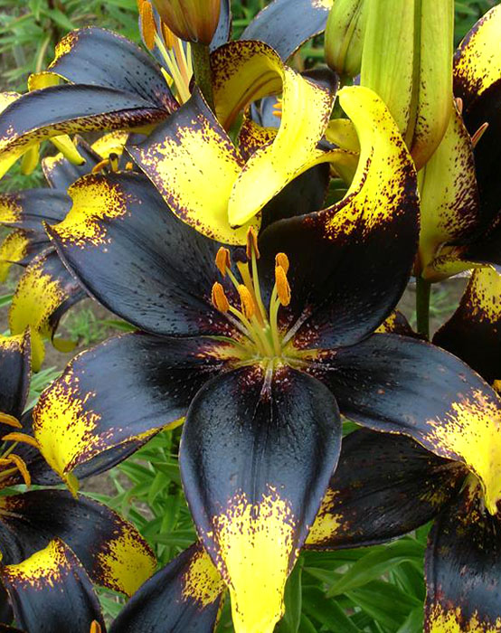 Окраска цветка : цветы золотисто-желтые, с многочисленными темными крапинками, сливающимися в широкую темно-лиловую сердцевину, классической звездчатой формы, широко-раскрытые, направлены вверх и в стороны