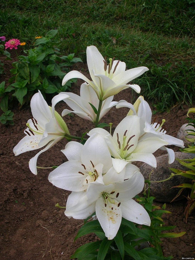 Саженцы и рассада Лилии ЛА-Гибрид Брайт Даймонд (Lilium) окажутся настоящим бриллиантом в ожерелье вашего цветника. Впрочем, даже название этого голландского гибрида можно перевести как «Яркий алмаз». Среди своих собратьев разновидность отличается удивительно чистым, белым цветом лепестков, на фоне которых выделяются крупные чёрные пыльники.