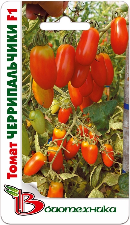 Семена томата "Черрипальчики F1" (Cherripalchiki F1) принадлежат к сорту, который подходит для выращивания как в открытом грунте, так и в вазонах, украшая балконы и лоджии. Куст имеет компактные размеры (высота около 40 см) и отличается декоративными качествами. Созревание плодов происходит на 85 день после появления массовых всходов. Сорт обильно плодоносит и дружно отдает урожай. Плоды красные, выровненные, весом 20-30 грамм, удлиненно-цилиндрические, плотные, не растрескиваются, очень ароматные и сладкие на вкус. Используют урожай в свежем виде и для цельноплодного консервирования.